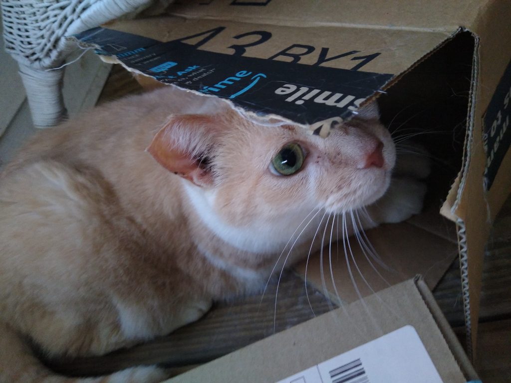 Marc from the side hiding in a box